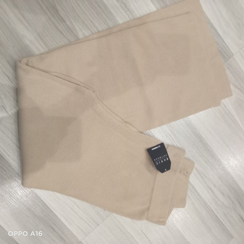 Bej renkte, midi boy, düz kesim kadın kumaş pantolon. Yumuşak sentetik kumaştan yapılmış, rahat ve gündelik kullanıma uygun.