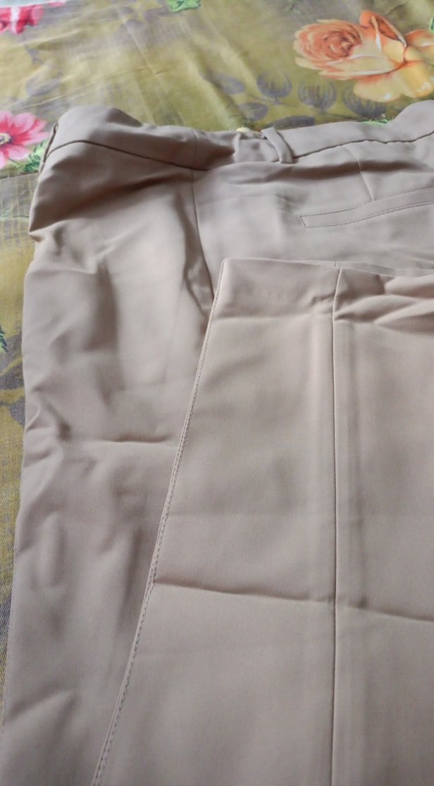 Bej renkte, düzenli kesim ve midi boyda kadın kumaş pantolon. Yumuşak sentetik kumaştan, drapeli detaylı. Ofis için minimal tarzda uygun.