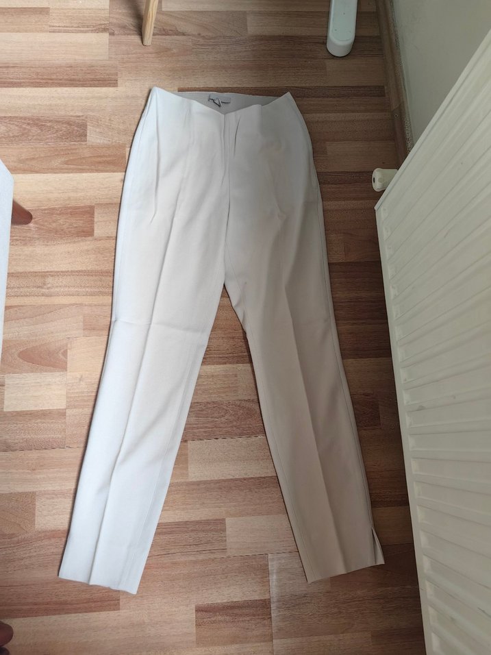 Bej pamuk kumaştan, normal kesim ve midi boy kadın pantolon, sade ve basic tarzda, ofis kullanımı için uygun. ✨Ufak bir lekesi var yıkanınca cıkar diye düşünüyorum