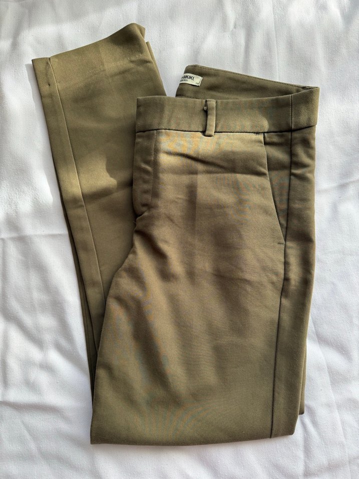 Bej renkli, normal boyda, regular fit kadın kumaş pantolon. Yumuşak ve parlak kumaştan, ofis için sade ve şık tasarım