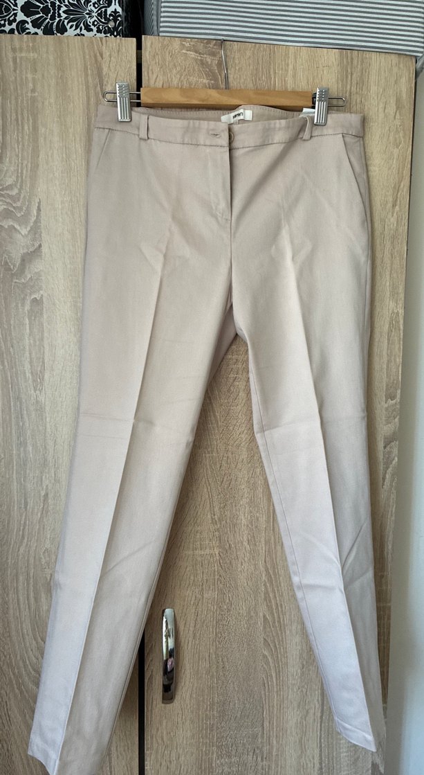 Bej renkte, pamuk kumaştan, normal kesim ve midi boy kadın kumaş pantolon. Ofis için sade ve şık bir görünüm sunar.