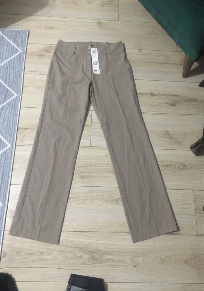 Bej renk, regular fit, midi boy kadın kumaş pantolon. Düz desensiz, yumuşak sentetik kumaştan, ofis şıklığı için ideal.
