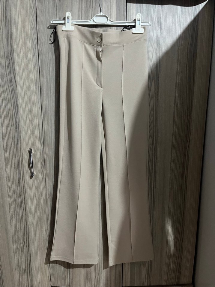 Bej renkli, regular fit, uzun paçalı kadın kumaş pantolon. Pilili ve yumuşak sentetik kumaştan, ofis kullanımı için uygundur.