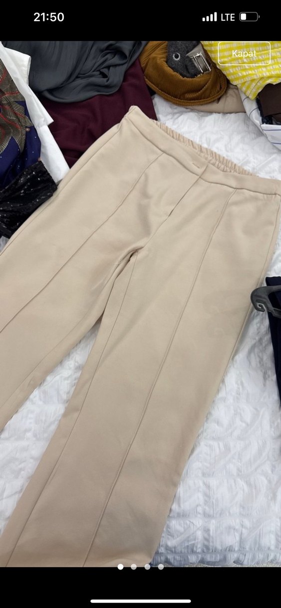 Bej renkte, düğmeli kadın kumaş pantolon. Rahat kesimi ve pastel tonuyla ofis için uygun, rahat bir tarz sunar.