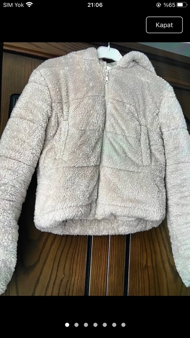 Bej renkli, kürk detaylı yumuşak ve sıcak kumaştan, uzun kollu, vücuda oturan kesime sahip kadın mont. Ürün m beden gözükmede kalıbı dar S beden uyumludur