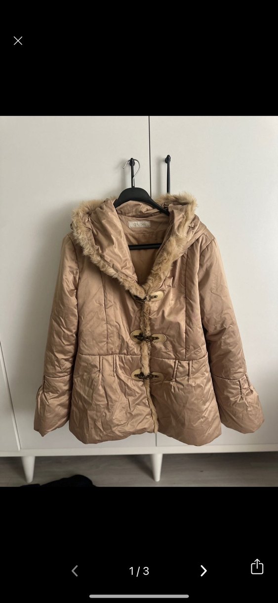 Bej renkli, parlak sentetik kumaştan yapılmış, kürk detaylı, normal uzunlukta ve strappy kollu genç kadın kışlık mont. Rahat sokak stiline uygun.