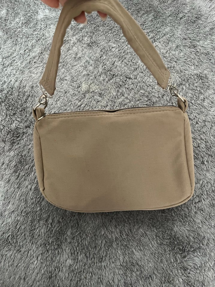 Sentetik kumaştan yapılmış, kürklü detaylara sahip bej kadın omuz çantası. Minimalist ve trend sokak tarzına uygun.