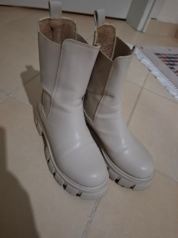 Bej renkte, kürklü detaylı, platform topuklu kauçuk botlar. Rahat ve desensiz, günlük kullanıma uygun şık sokak stili botlar.