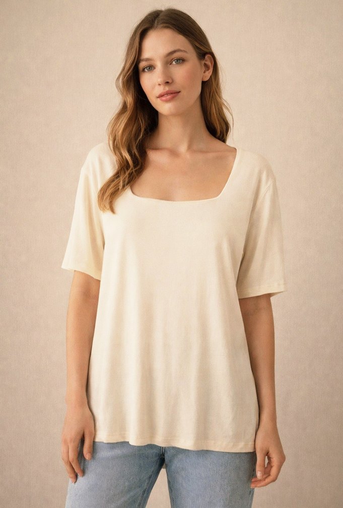 Bej renkte, pamuk kumaştan, kısa kollu ve geniş yaka tasarımlı, rahat kesim kadın tişörtü. Günlük kullanıma uygun, salaş ve konforlu.1 2 3 4 beden