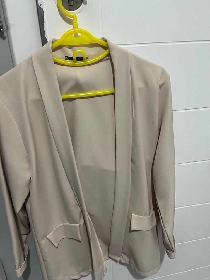 Bej renkli,midi blazer ceket. Uzun kollu ve normal kesim, ofis ve günlük kullanıma uygun. Yumuşak sentetik kumaştan üretilmiştir. L-XL beden