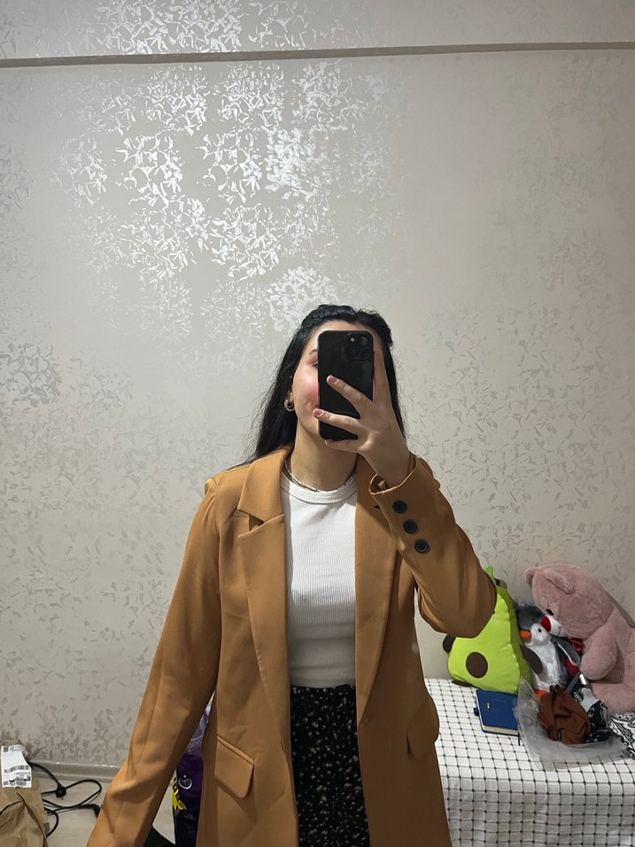 Bej renkte, notched lapel yakalı ve uzun kollu kadın midi blazer ceket. Düz, sentetik kumaştan, rahat kesimli ve günlük kullanıma uygun, şık bir parça.