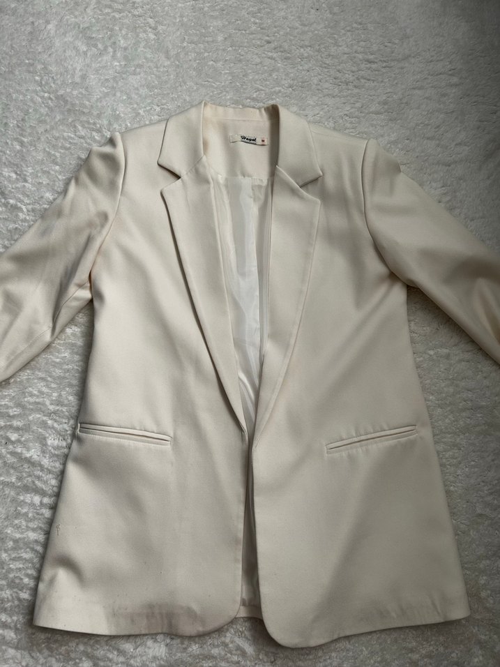 Bej renkli, düğmeli, uzun kollu kadın blazer. Normal kesim ve midi boyda dolapta fazla beklediği için kuru temizleme şart maalesef hiçbir defosu söz konusu değildir.