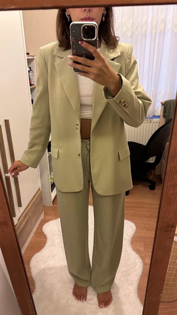 Bej renkli, uzun kollu ve düğmeli kadın blazer ceket. Normal boy ve regular fit kesim, ofis ve günlük kullanıma uygun, ipeksi dokuda.