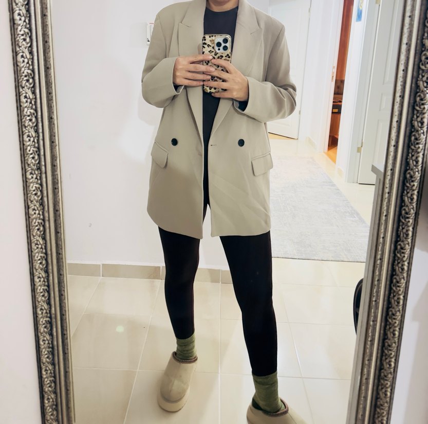 Bej rengi, uzun kollu, notched lapel yakalı kadın midi blazer. Regular fit, çift düğmeli, minimal ve sade tarz sunar. Günlük kullanım için uygun, düz desensiz.