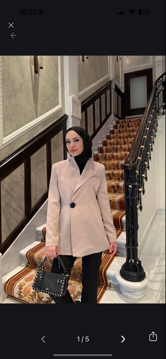 Bej renk, tek düğmeli, uzun kollu ve kesimli yakalı midi blazer. Sentetik kumaştan, ofis şıklığı için sade ve rahat kesim.