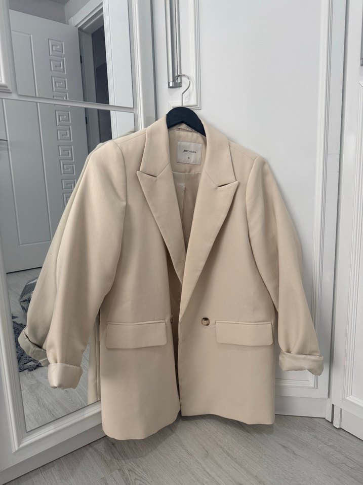 Bej renkli, uzun kollu, kırlangıç yaka kadın blazer ceket. Yumuşak keten kumaştan, düğmeli ve normal kesim. Ofis ve günlük kullanıma uygun.