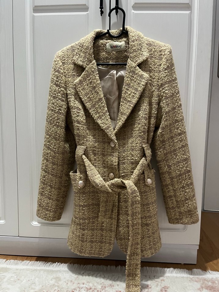 Bej renk, düğmeli ve kemerli midi boy kadın yün ceket. Normal kesim, şık ve rahat, ofis için uygun, Paris tarzında. 2 defa giyildi