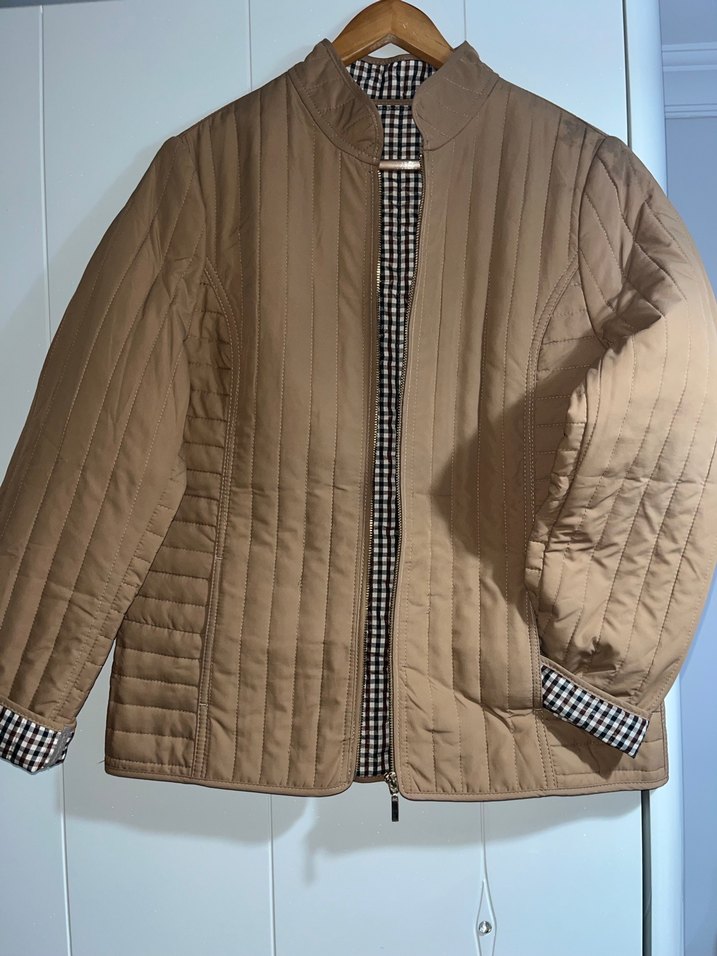 Bej renkte, uzun kollu, yakalı ve fermuarlı kadın ceket. Parlak kumaştan, midi boyda ve regular fit kesime sahip, günlük kullanıma uygun içi ekoseli :)