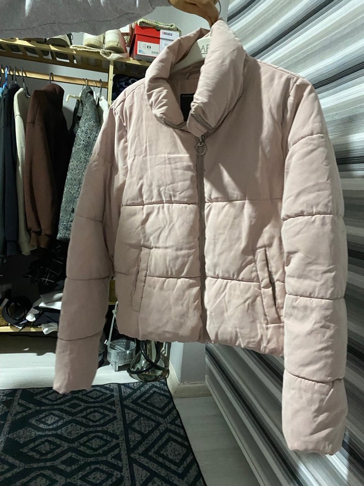 Bej renkli, düğmeli ve yüksek yakalı kadın kışlık mont. Uzun kollu, orta boy ve vücuda oturan kesimde, yumuşak ve sıcak kumaştan. Pudra pembe