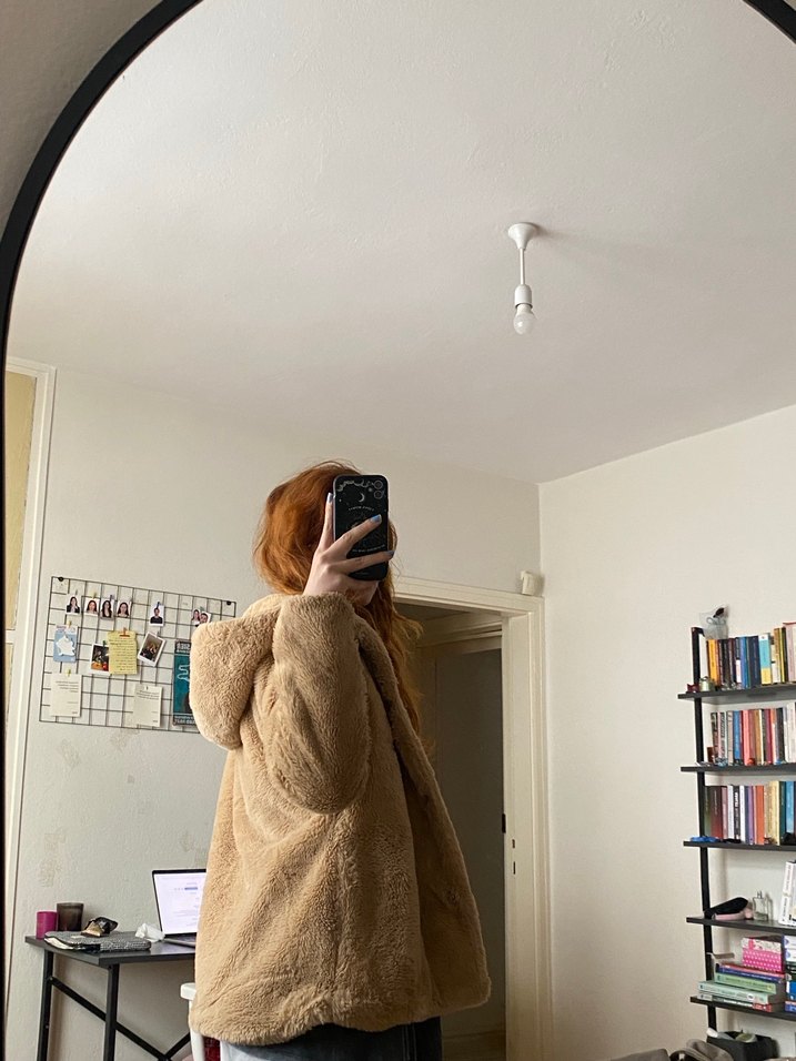 Bej renkli, midi boy, kürklü detaylı kadın kabanı. Uzun kollu ve bol kesimdir. Yumuşak, sıcak kumaştan üretilmiştir. m l uyumlu. sorunsuz