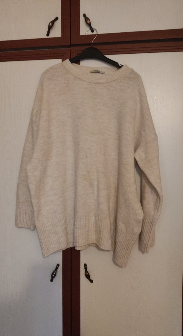 Bej renkli, uzun kollu, yuvarlak yakalı kadın midi boy örme kazak. Yün dokusuyla rahat ve sade bir tarz sunar. fotoğraf da gösterdiğim gibi çok az lekesi var oda çok dikkat çekmiyor