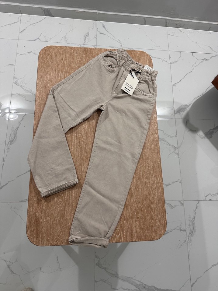Bej renk, pamuklu kumaştan yapılmış, normal kesim ve midi boy kadın jean. Günlük kullanıma uygun sade ve rahat bir stil sunar.