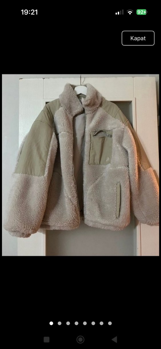 Bej renkli, peluş detaylı kadın ceket. Midi boy, bol kesim ve yaka detaylı. Uzun kollu, rahat ve sokak stiline uygun.