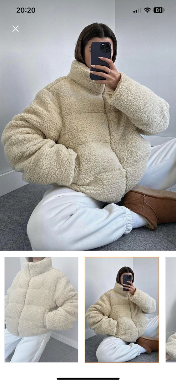 Bej renkli, yüksek yakalı, uzun kollu ve bol kesim kadın kışlık peluş ceket. Yumuşak ve sıcak kumaştan, kürk detaylı, rahat sokak tarzı için ideal.