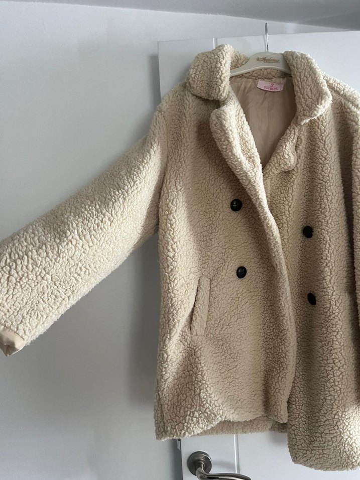 Bej renkte, peluş detaylı, normal uzunlukta ve geniş kesimli kadın kabanı. Uzun kollu ve yaka kısmı çentikli, rahat günlük kullanım için uygun.
