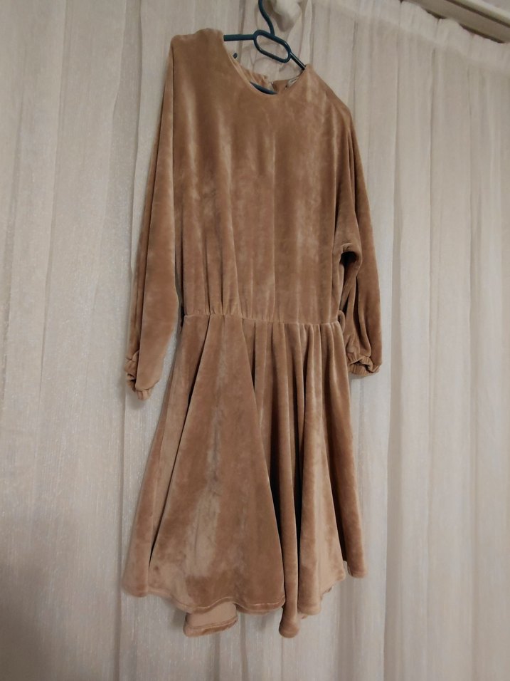 Bej renkte, midi boy, uzun kollu ve bol kesim kadın elbisesi. Yumuşak ve rahat kumaştan yapılmış, desensiz ve normcore tarzda bir model.