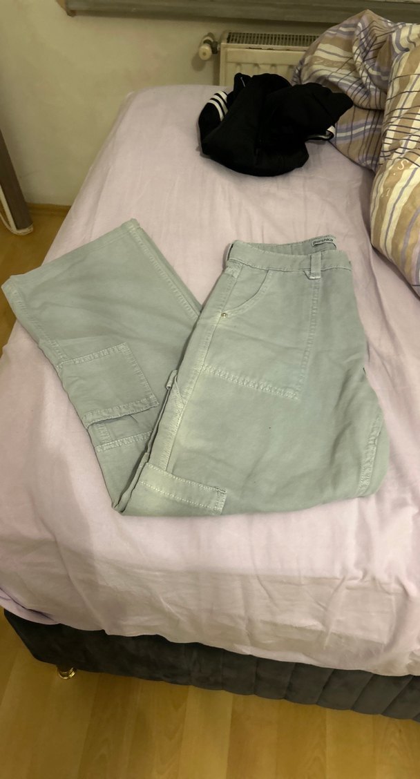 Bej renkte, midi boy ve salaş kesim kadın denim pantolon. Günlük kullanıma uygun, rahat ve şık sokak stili pantolon.
