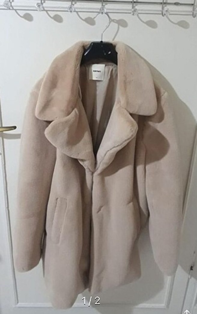 Yumuşak fleece kumaştan yapılmış, bej renkte, notched lapel yakalı ve uzun kollu bol kesim suni kürk ceket. Rahat ve şık bir görünüm sağlar.Ciddi alıcılara pazarlık yapılır.