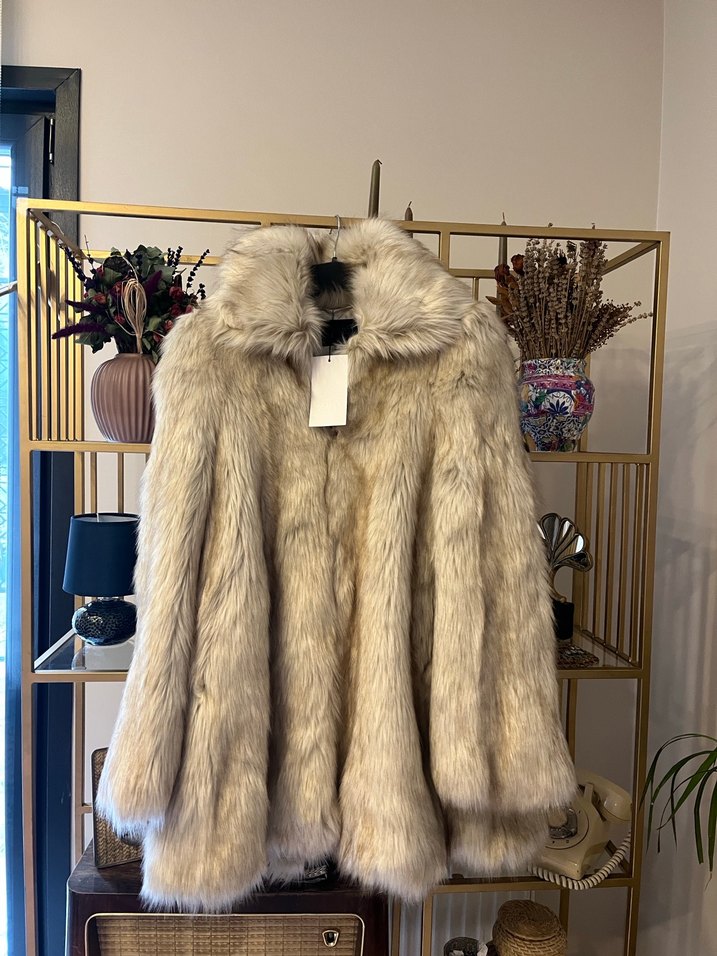 Bej midi boy suni kürk ceket, bol kesim ve çentikli yaka ile. Uzun kollu, yumuşak sentetik kumaş ve kürk detaylı, günlük kullanım için uygundur.