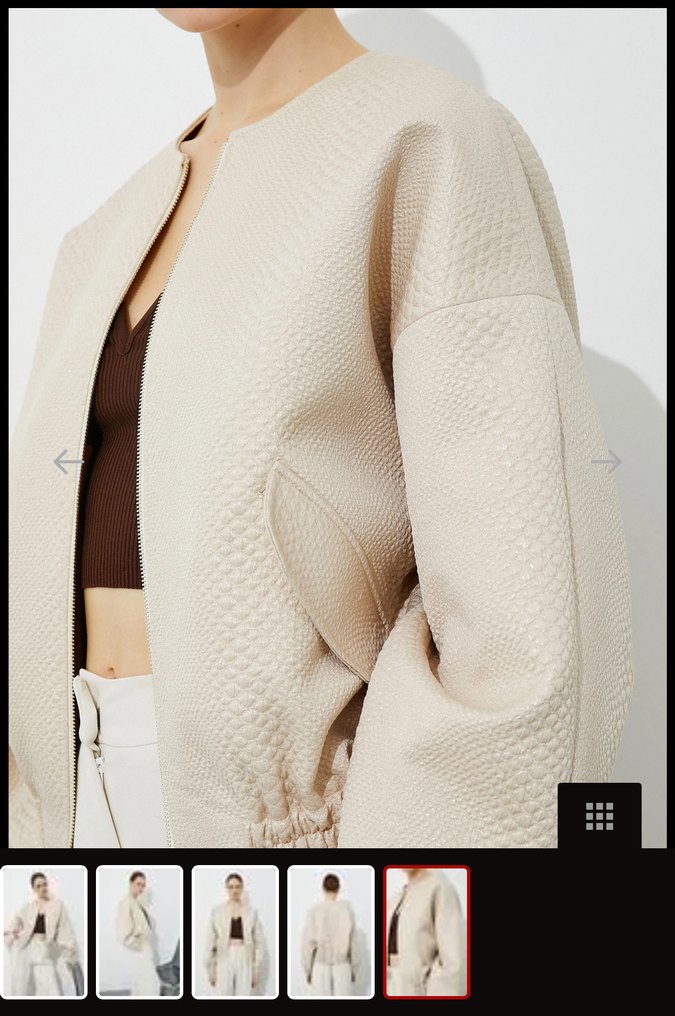 Bej renkli, yılan desenli dokulu, sentetik kumaştan yapılmış uzun kollu ve salaş kesim midi uzunluğunda kadın ceketi. Günlük kullanıma uygun, rahat ve şık bir seçenek. Bir saat giyildi