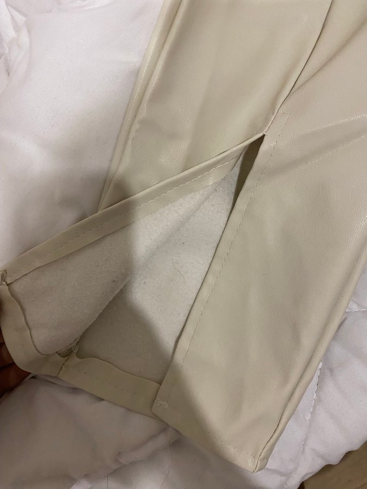 Bej renk, midi boy, regular fit kadın deri pantolon, yırtmaç detayıyla sade ve minimalist tarzda, günlük kullanıma uygun.