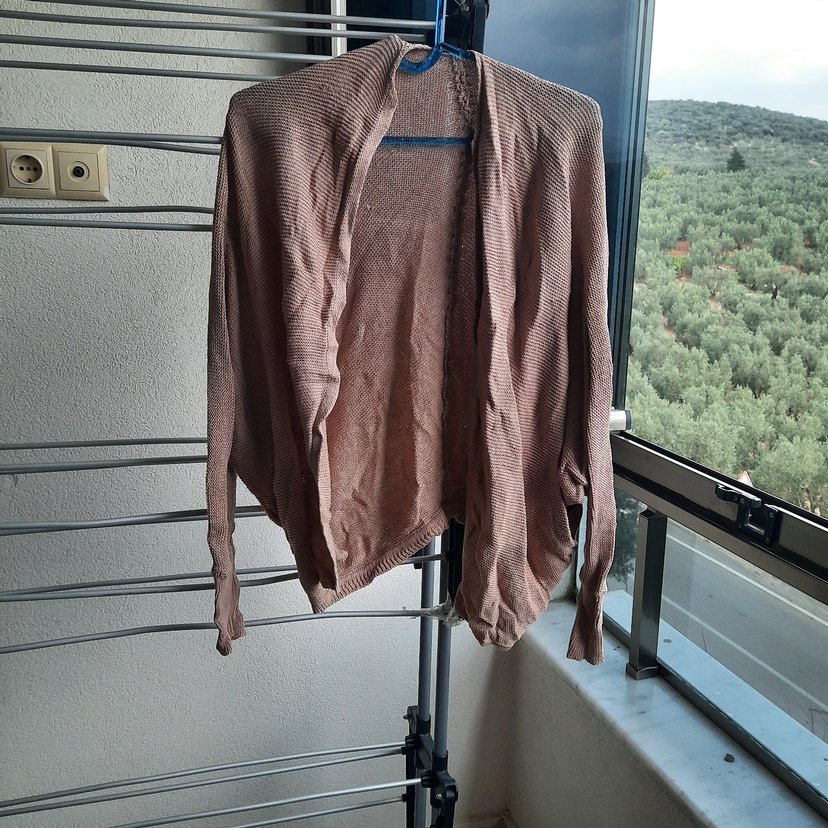 Yumuşak keten kumaştan, uzun kollu, bej renkli ve dökümlü ön yüzü olan bol kesim midi hırka. Günlük rahat kullanım için uygundur.