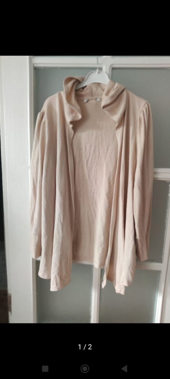 Bej renkli, keten kumaştan midi boy, yüksek yakalı ve dökümlü tasarıma sahip kadın hırka. Uzun kollu ve bol kesimdir, günlük kullanım için uygundur.