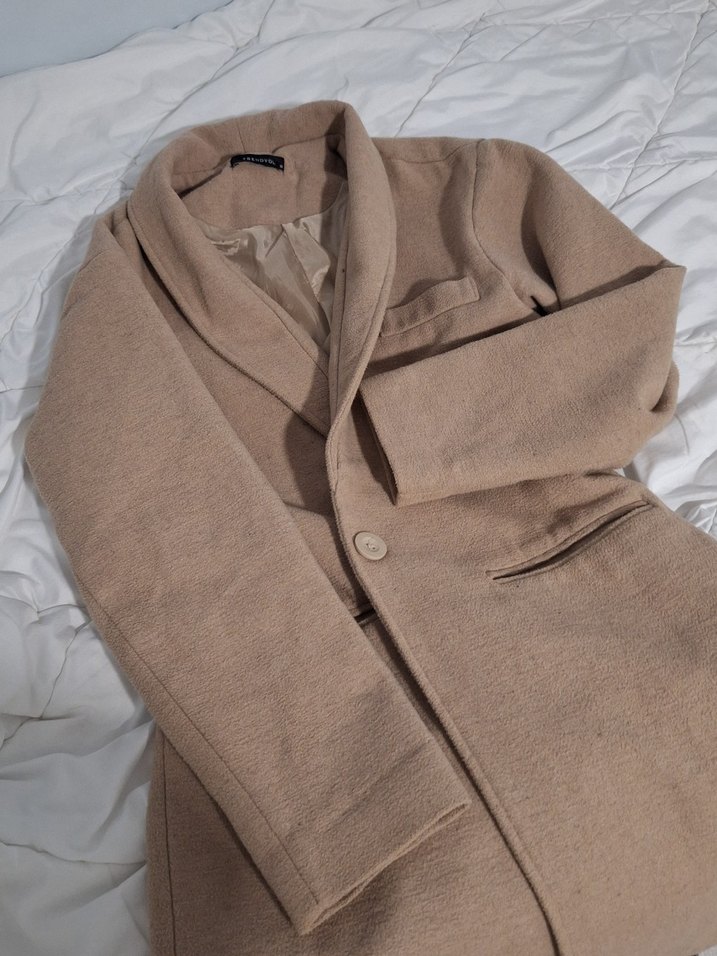Bej renkte, keten kumaştan kadın midi kaban. Düğmeli, uzun kollu ve normal boyda, rahat bir kesime sahiptir. Aldiktan sonra iade etmeye vaktim olmadi. Hic giyilmedi.