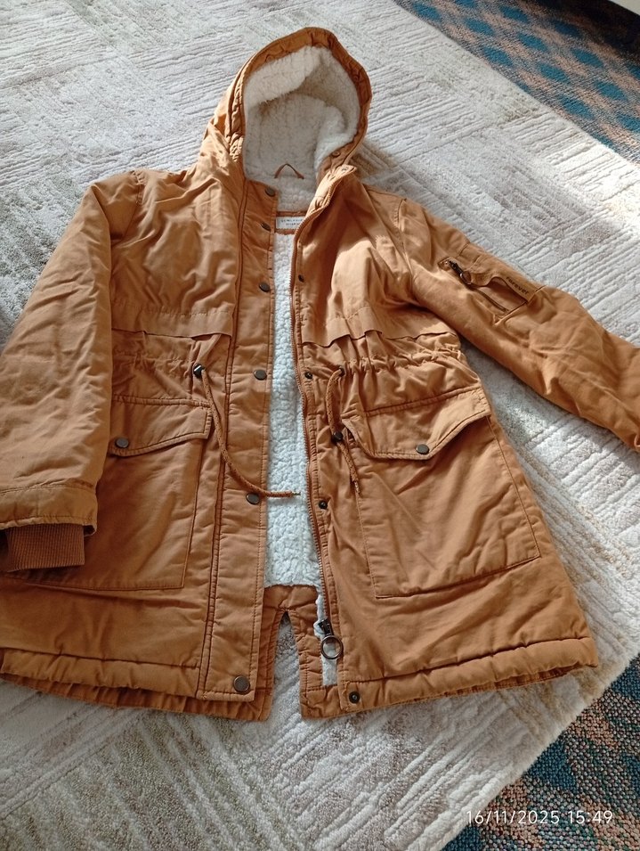 Bej renkli, kürklü detaylı kadın kışlık kaban. Notlu yaka, uzun kollu ve rahat kesim , günlük sokak stili için uygun.
