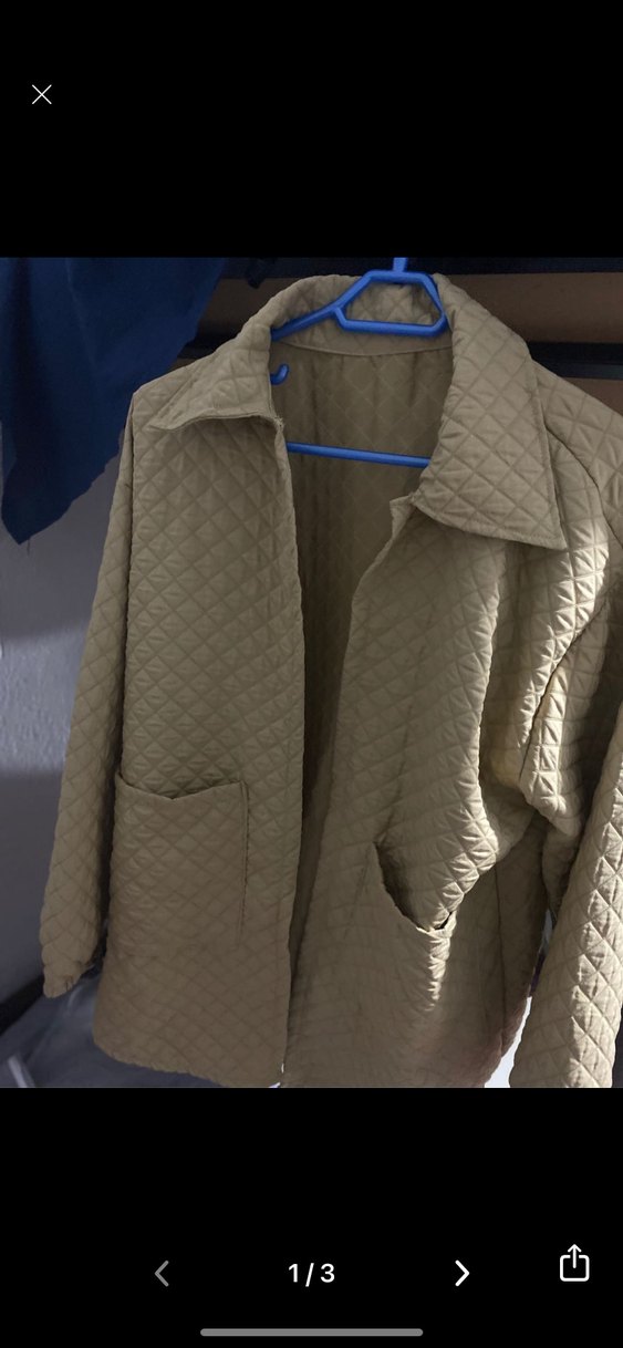 Bej uzun kollu, kapitone dokulu, düğmeli, normal kesim ve iki ön cepli midi ceket. Günlük kullanım için uygundur.