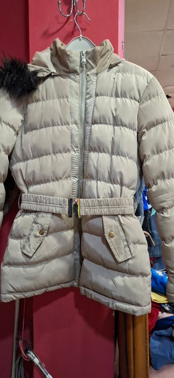 Kemerli ve yakalı, sentetik kumaştan yapılmış, bej renkli, midi boy, dar kesim kadın kışlık mont. Sokak stili için uygun, rahat ve şık bir dış giyim parçası. ❄️ taş gibi sapasağlam