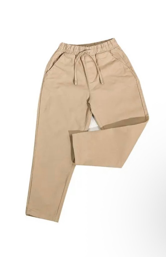 Bej renkli, midi boy, regular fit kumaş pantolon. Lastikli bel ve rahat kesimiyle günlük sokak stili için uygundur.