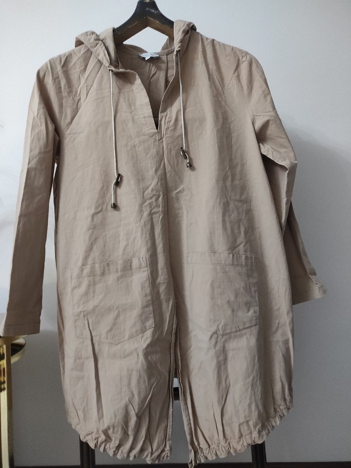 Bej renkte, keten kumaştan, uzun kollu ve notalı yaka detaylı, midi boyda salaş kesim yağmurluk. Günlük rahat stil için uygundur. ️