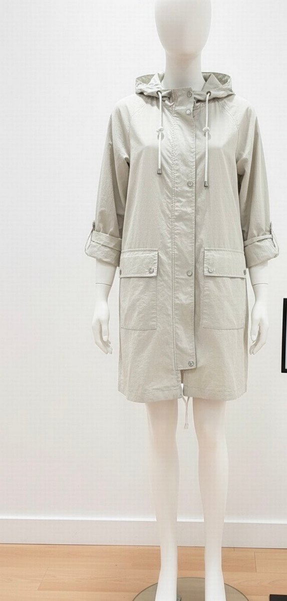 Butik ürünü Bej keten kumaştan, düğmeli, normal boy midi yağmurluk. Uzun kollu, yakası kesimli, salaş kesimle günlük sokak stiline uygun.