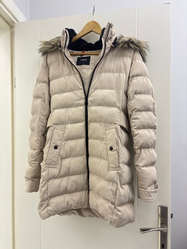Bej renkte, kürk detaylı kapüşonlu kadın kışlık mont. Notlu yaka, uzun kollu ve normal uzunlukta, rahat kesim ve yumuşak, sıcak kumaştan üretilmiştir.