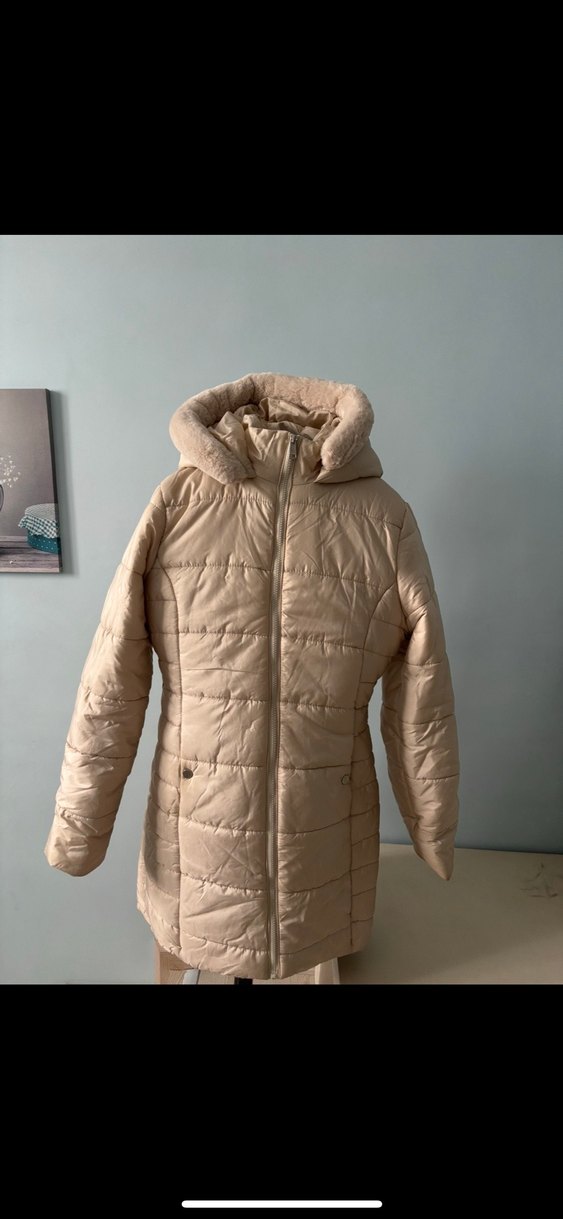 Bej renkte, kürklü yakalı ve fitted kesime sahip kadın midi kışlık mont. Uzun kollu ve yumuşak, sıcak tutan kumaştan üretilmiştir. ❄️42 beden yazmaktadır fakat 38-40 bedene daha iyi olur
