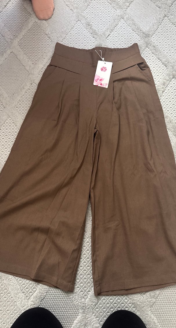 Bej renkli, midi boy, bol kesim kumaş pantolon. İpeksi dokusu ve rahat stiliyle günlük sokak modasına uygun, zahmetsiz şıklık sunar.