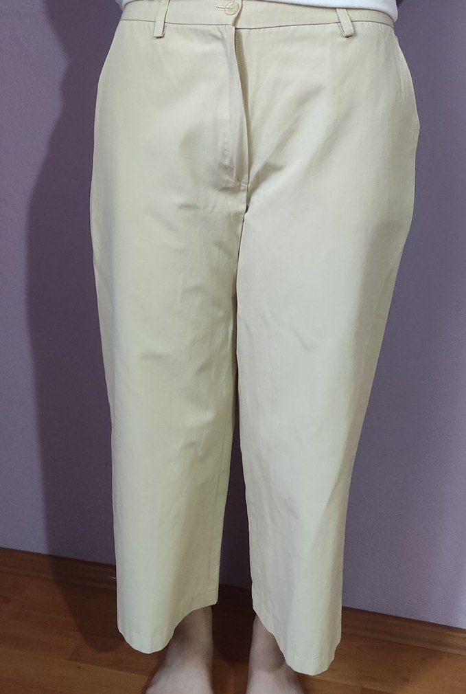 Bej renkli, midi boy, regular fit kadın kumaş pantolon. İpeksi dokusu ve pastel tonuyla ofis için şık ve rahat bir tercih.