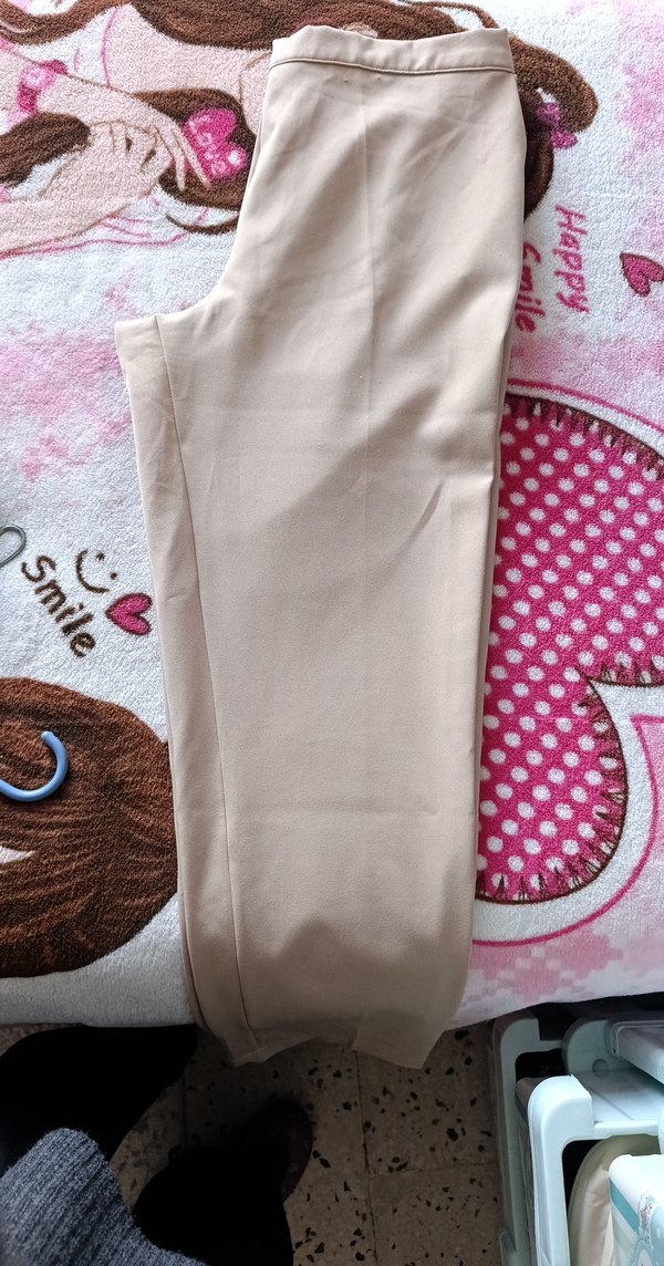 Hafif bej renkte, midi boy, regular fit kadın kumaş pantolon. Düz ve sentetik dokulu, fermuar detaylı, günlük kullanıma uygun minimal tarzda.