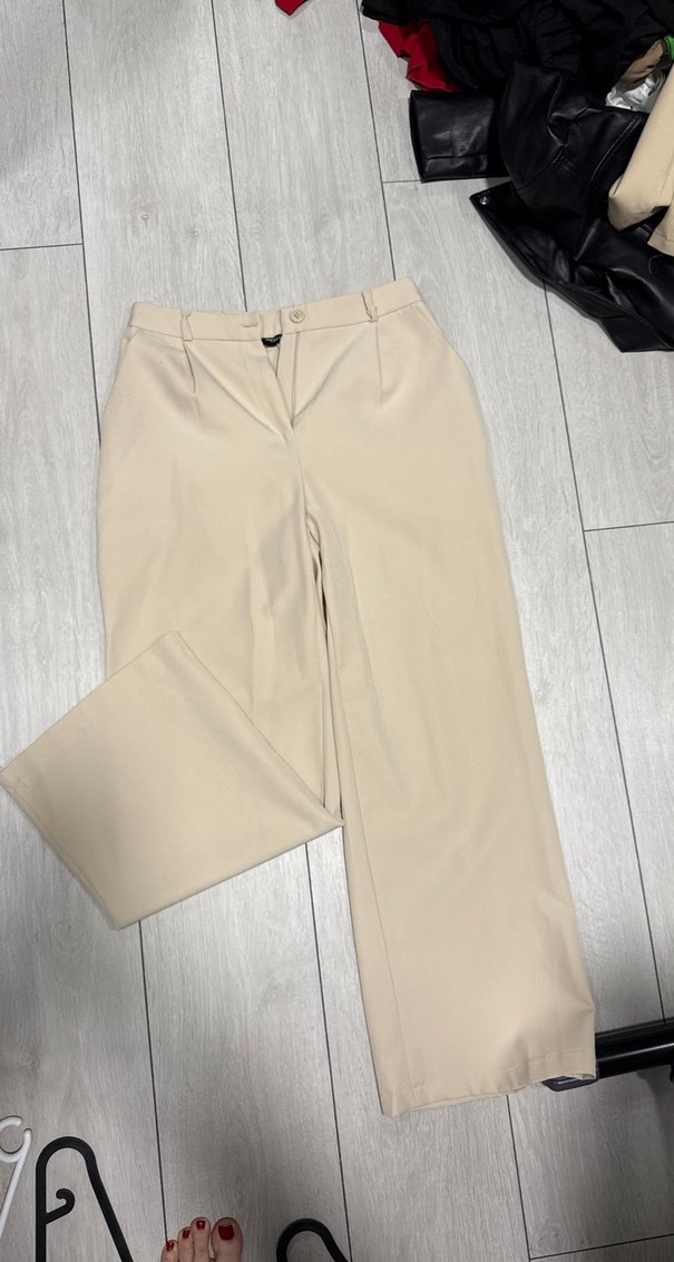 Bej renkli, düz ve midi boyda kadın kumaş pantolon. Rahat kesimi ve sentetik kumaşıyla ofis ve günlük kullanıma uygun, sade ve şık.